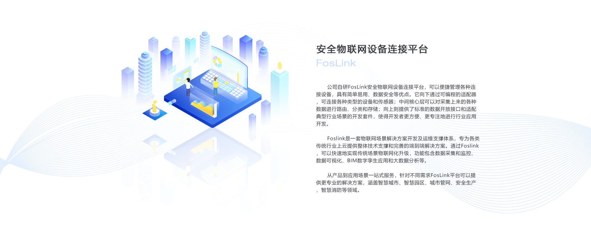 Foslink是一套物聯(lián)網(wǎng)場(chǎng)景解決方案開(kāi)發(fā)及運(yùn)維支撐體系,專為各類(lèi)傳統(tǒng)行業(yè)上云提供整體技術(shù)支撐和完善的端到端解決方案。通過(guò)Foslink,可以快速地實(shí)現(xiàn)傳統(tǒng)場(chǎng)景物聯(lián)網(wǎng)化升級(jí),功能包含數(shù)據(jù)采集和監(jiān)控、數(shù)據(jù)可視化、BIM數(shù)字孿生應(yīng)用和大數(shù)據(jù)分析等。